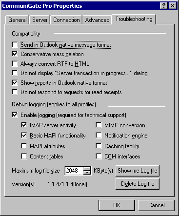 Open the Troubleshooting panel in the MAPI Connector ("CommuniGate Pro Service") setup box: